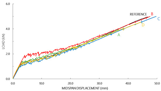 After the loading–unloading cycles, the residual static behavior was quantified by means of a quasi-static four-point bending test. As for the TRC coupons, the only observed degradation phenomenon was the formation of cracks. For SW CYCL 1.0 MPa no cracks were observed during the cyclic loading and, thus, the residual behavior was very similar to the behavior of SW REF (Figure 17). As can be seen in Table 10 both the stiffness and strength of SW REF and SW CYCL. 1.0 MPa were situated in the same range.
