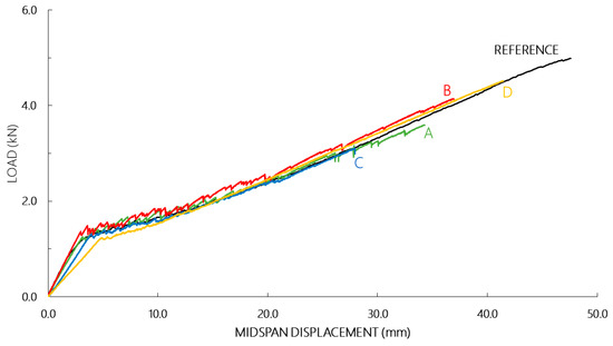 Quantitive comparison of some distinctive parameters of the static load-displacement curve: the average reference versus the beams cyclically preloaded to 2.0 MPa.