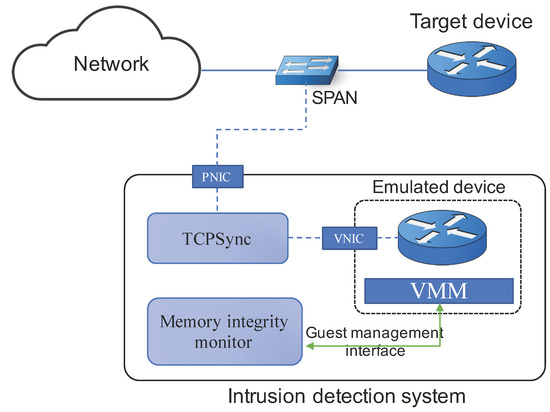 The fundamental challenge of an intrusion detection system for network devices is to provide an accurate detection of memory modification with low false positive (identifying remote code attacks that break the integrity of target’s memory) [18]. Another important challenge of the system is to provide transparency over both the target device and the network. That is, the system must achieve its functional goals without affecting internal states of the target device as well as its network configuration (i.e., topology). To address the above challenges, we propose a VM-based intrusion detection system, which is described in detail in next section.