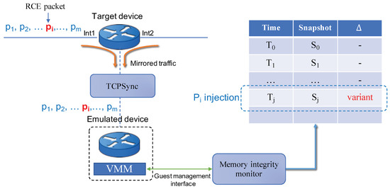 Figure 2 shows how a remote code execution attack against a target device can be detected by the proposed system. Suppose that the target device receives m ingress packets sequentially, among which a packet contains maliciously crafted payload that will cause unauthorized modification of memory in the device. Those packets are mirrored to TCPSync, which in turn forwards the packets to the emulated device. Since a firmware image of the emulated device is identical to that of the target device, the crafted packet will also cause memory corruption accordingly. Memory integrity monitor takes memory snapshots at every time epoch from the emulated device. It will find out that a snapshot taken at time after the crafted packet has been injected has a variant in its hash value compared to previous snapshots, which indicates that memory corruption by the attack has been occurred.
