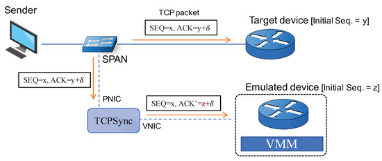 - TCPSync: It is a software module, running outside the emulated device that forwards all received packets from a PNIC, transforming some packets if necessary, to a VNIC attached to the emulated device. The main work of this module is to conduct transparent conversion of certain packet flows through connection-oriented protocols such as TCP. Details on TCPSync will be presented in the next section.
