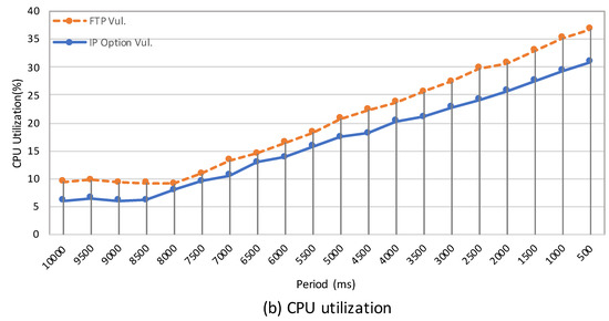 In our experiment, the laptop PC mounts an attack to the target router by sending crafted packets of the aforementioned vulnerabilities. Throughout the experiment, we measured the average detection time of the attack varying the interval at which the memory integrity monitor takes snapshots, as well as its performance overhead. Figure 4 shows the experimental result. The detection time steadily decreases as the interval of taking a snapshot is getting shorter. However, due to the inevitable delay for the memory dump, we need at least around 1500 ms to detect the attack (Figure 4a). Achieving faster detection comes at the cost of higher CPU use (Figure 4b). From the graph, we can infer that the period of 3000–3500 ms would give the optimal solution in terms of the detection time as well as the CPU consumption. It is worth noting that the attack exploiting the FTP server vulnerability needs more time in detection as well as more CPU than the other. This is because that the crafted packet for the FTP server should be constructed at the TCP layer, which requires the time-consuming operation of TCPSync.