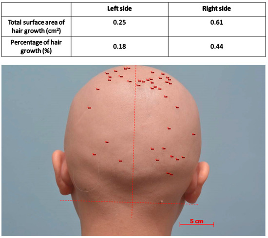 Total surface area and the percentage of hair growth on each side of the scalp before laser treatment. (Percentage of hair growth % = total surface area of hair growth on one side of the scalp/total surface area of the same side of scalp.)