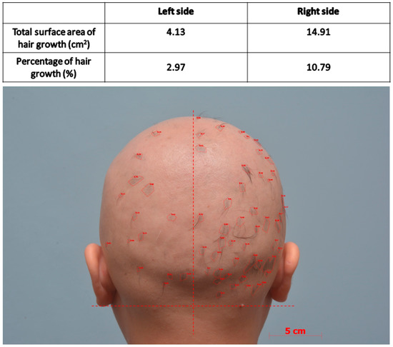 Total surface area and the percentage of hair growth on each side of the scalp after laser treatment. (Percentage of hair growth % = total surface area of hair growth on one side of the scalp/total surface area of the same side of scalp.)