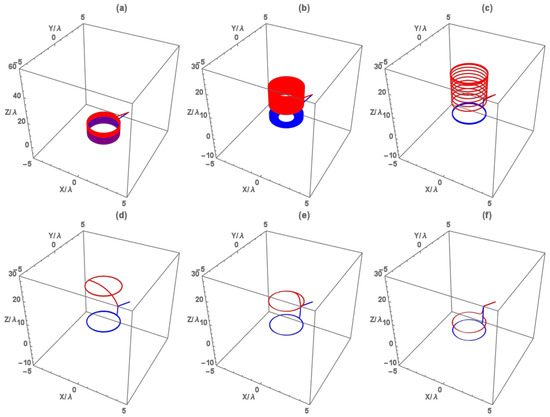 Particle trajectories for different values and for both enantiomers ( blue and red). (a) Hz, (b) Hz, (c) Hz, (d) Hz, (e) kHz, and (f) kHz.