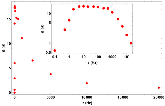 This result can be clarified in Figure 3, where the behavior of enantiomeric separation (, defined as the axial distance between trapped enantiomers) is represented as a function of . As previously mentioned, there is a fast increment of when rises, obtaining a maximum value of 18 for Hz, which remains nearly constant (see the inset graphics in Figure 3), until reaching a value of Hz to decrease slowly subsequently.