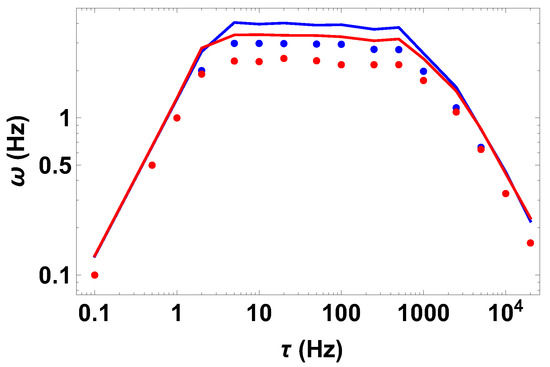 As can be observed in Figure 5, at low and high values, the frequency of the circular trajectories shows similar values for both enantiomers (1 kHz 1 Hz). However, for values between 1 and 1000 Hz, the frequency is nearly constant and equal to 2 Hz for enantiomers with and 3 Hz in the case of . One explanation for this result could be that, at the final time, particles describe a limit cycle in which reaches a limit value (each enantiomer goes to a final z position that depends on their value and de-phase ) at the fixed value (see Figure 2). In this case (when the limit cycle is reached ), Equations (28) and (30) can be approximated to: