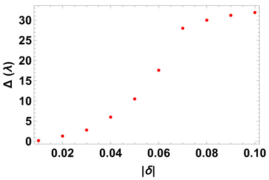 In this case, both enantiomers will be trapped in the same region, as shown in Figure 2a, and as a result, there is no effective enantiomeric separation. Figure 2b–f shows the enantiomeric separation produced by the action of the chiral optical conveyor described by Equations (1), (7), and (25)–(27). As can be observed, the particle trajectories are spiral in all cases, the pitch and velocity of optical conveyors being strongly dependent on de-phase parameter [19]. In this sense, the behavior of chiral conveyors is very similar to dielectric conveyors, and the main difference from the results obtained in [19] is that the movement of particles in the z direction is limited due to the axial dependence of parameters and . Furthermore, as can be seen in Figure 2, on increasing , the enantiomeric separation also increases until it reaches a maximum separation that slowly decreases for high values of de-phase .