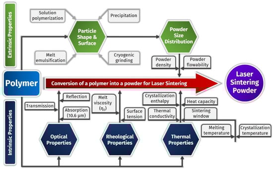 The intrinsic polymer properties in the bottom section of the diagram in Figure 1 can be established by choice of the material grade, or better, by specific design of the polymer chains and architecture via chemistry. The extrinsic properties in the top part of the diagram are those associated with the shape, size, and mechanics of the powder particles the material consists of. Tuning and optimization of these properties is done by selection of an appropriate powder production technology and subsequent classification methods.