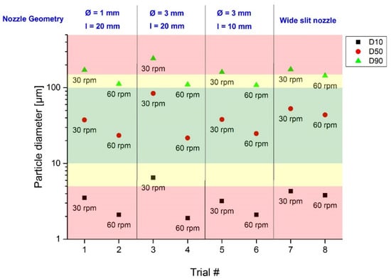 Particle size (D10, D50, D90) in dependence of nozzle selection and extruder rotational speed. Colored regions indicate optimal size region (green), suboptimal size regions (yellow), and undesired size regions (red).
