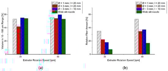 (a) Percentage of total particle volume with a size that lies in the range of 10–100 µm in dependence of nozzle selection and extruder rotational speed; (b) Amount of PBT that comes out of the extruder in fibrous state, relative to total PBT blend content.