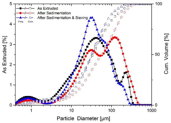 The fact that fine particles were removed can also be observed in the size distribution of the settled powder left at the bottom of the tank. In Figure 5, this distribution, represented by the red curve, is clearly shifted to the right with respect to the initial, as extruded distribution. To make the powder suitable for laser sintering in terms of particle size, also the largest particles need to be removed. This was done by sieving the powder through a vibrating sieve with a 150 µm mesh width. The final resulting size distribution is also shown in Figure 5 (blue curve). Table 3 lists the characteristic values for the distributions. Through the entire classification process, the percentage of particles within the desired 10–100 µm range can be increased by at least 10, from 67.7 to 78.7.