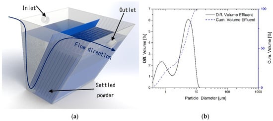 (a) Schematic representation of the designed settling tank; (b) Particle size distribution in the effluent from the outlet of the settling tank.