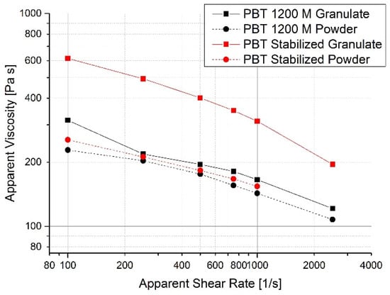 Apparent viscosity of PBT granulates and powders at 250 °C.