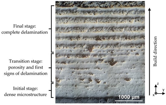 A cross-section of a tensile bar was investigated with optical microscopy to assess its morphology and microstructure. The bar was produced in a different build job than the bars that were tested in the previous section, but was built with the same scanning parameters and temperatures. Considerable curling of the bar was observed during the build job. As a result, the part started to delaminate, which can clearly be seen in Figure 12. Along the build direction, from bottom to top, the part initially has a dense microstructure. As the build progresses, first signs of delamination can be seen, along with some larger pores. During the last stage, individual layers can be distinguished, alternating with voids containing unmolten particles. Although the curling of the investigated part was more extreme than for the tested tensile bars, it is likely that the microstructure of those bars shows similarities to the transition region shown in Figure 12. This also partly explains the poor mechanical properties.