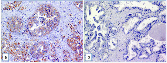 Figure 1. (a) ABCB5 staining on breast cancer tissue used as positive control (Immunoperoxidase stain; original magnification 150×); (b) absence of expression of ABCB5 in benign prostatic tissue used as negative control (Immunoperoxidase stain; original magnification 150×).