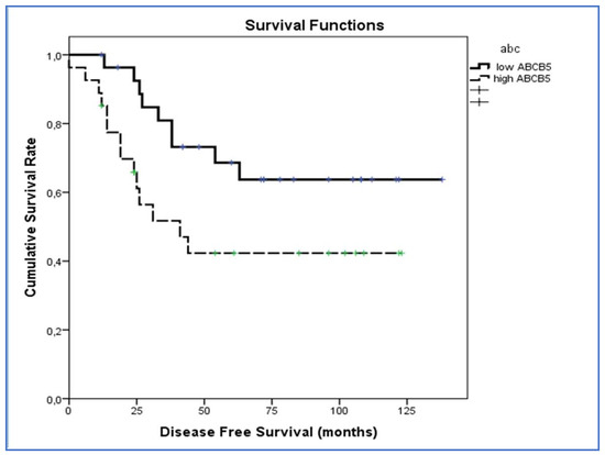 Figure 4. Kaplan–Meier survival analyses in patients with uveal melanomas with low and high ABCB5 expression. The log-rank test showed a significant difference (p = 0.039) between the two groups in ABCB5 expression.