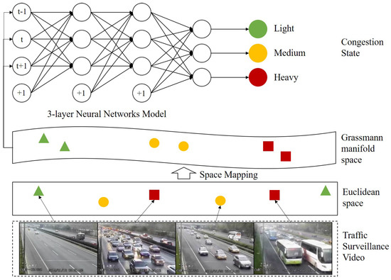 After the feature extraction and spatial mapping processing based on Grassmann Manifold, in order to express the spatio-temporal correlation of traffic information, we input the features in the Grassmann manifold space into the neural network. Through the three-layer neural network, the extracted features are classified according to three states: “light”, “medium” and “heavy”. Finally, the traffic status is obtained, as shown in Figure 1.