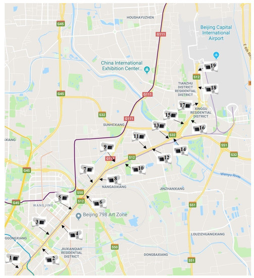 (2) Capital Airport Expressway Dataset: The dataset is established by ourselves. We first select suitable videos from a large number of TSVs of Beijing Capital Airport Expressway. After the selection of record clear, situation mutative, all the required status contained videos, we convert videos from .ts format into .avi format. Then we choose videos from the same camera at different time and intercept each video segment into 5 s. Then we save these video segments as original data matrices by specific algorithm, forming our own dataset. After extracting the Grassmann manifold characteristics, the dataset is used in traffic status classification based on sparse representation and neural network. We select the videos of Capital Airport Expressway by filtering videos from 19 surveillance video cameras. The map of airport expressway in Beijing and the 19 cameras on the expressway are shown in Figure 4.