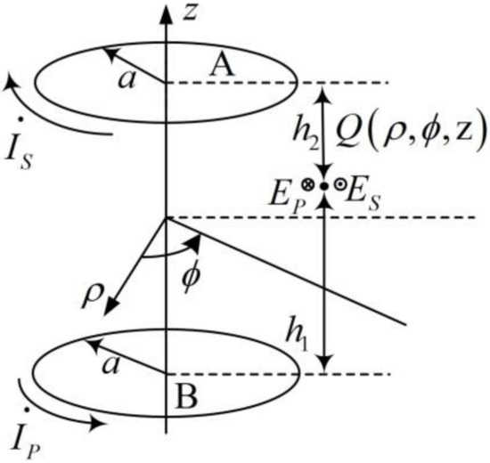 An electric field illustration of the sampling point in the double-coil system is given in Figure 5. The radius of each coil is a. The current in the primary and secondary coil is defined as IP and IS, respectively. NP and NS are the numbers of turns in the two coils, respectively. The distances from CoilP and CoilS to the point Q are denoted as h2 and h1, respectively.