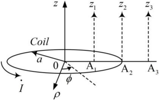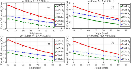 As shown in Figure 7, the radius of the coil is a and the coordinates of points A1, A2 and A3 are (a/2, π/2, 0), (a, π/2, 0) and (3a/2, π/2, 0), respectively. The moduli of the electric field, changing with z at z1, z2 and z3, are given in Figure 8a–d, where I and f denote the effective current value and the frequency in the coil, respectively. In Figure 8, MAT represents the results obtained by the analytical results of electric field using MATLAB, and COM represents the simulation results using the finite element software COMSOL.