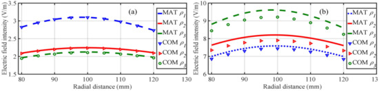 The symbols MAT and COM have the same meanings as those in Figure 8. The maximum deviation between the results obtained with these two methods is 4.3% under the condition that the number of turns of both coils is 8 and that the test point on ρ3 is the closest point to the secondary coil. When the number of coils turns increases, the total height of the coil becomes larger compared with the results when N = 4, and the current distribution in the coil becomes much more complex, where the relative error turns out to be larger when the test point is nearer to the coil. However, it is still an acceptable relative error. Hence, Figure 10 verifies that the formula E = EP + ES can be used for the calculation of total electric field between coupled coils in an IPT system. Similarly, for the magnetic field strength, H = HP + HS can also be verified. In the next section, an IPT experimental system is set up to further validate the analytical solution.