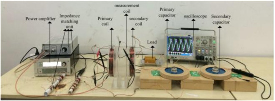 Secondly, to achieve full resonance (i.e., the primary side and secondary side are both resonant), a compensation capacitor must be connected in series with the primary coil. The experimental circuit configuration is shown in Figure 11. The experimental set up is shown in Figure 12, and the frequency of the power amplifier shown in Figure 12 was maintained at f0 = 486.7 kHz, and the compensation capacitance CP was adjusted until the voltage and current of the power source were in the same phase, at which point the circuit achieves full resonance.