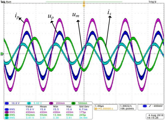 Figure 13 shows waveforms of the experiment result, measured by Tektromix DPO4104B when the effective current on the primary side was 0.499 A and h1 = 52 mm. The purple line is the primary side current ip, the dark blue line is the output voltage of the power amplifier up, the green line is the induced current in the secondary side coil is and the light blue line is the induced voltage of the measurement coil um.