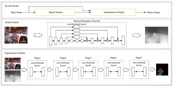 To reduce the cost in labelling, image-level annotations and bounding boxes have been adopted by weakly supervised methods to improve segmentation [19,20,21]. Additionally, scribbles and points have been introduced in [18,22] as auxiliary supervision. Unlike most weakly supervised methods, depth information is utilized in this paper as guidance to help distinguish foregrounds from backgrounds and use the limited capacity of a CNN model more on foreground areas. A module for depth estimation was trained firstly, then the concatenation of the depth predictions and RGB images composed the input to the segmentation module during both training and testing processes. For simplicity, we used the Depth-Module (DM) and Segmentation-Module (SM) to represent the two modules. The depth annotations from RGB image pairs with overlapping viewpoints could be obtained automatically [23] with multi-view stereo (MVS). The two modules composed the Overall Model (OM).