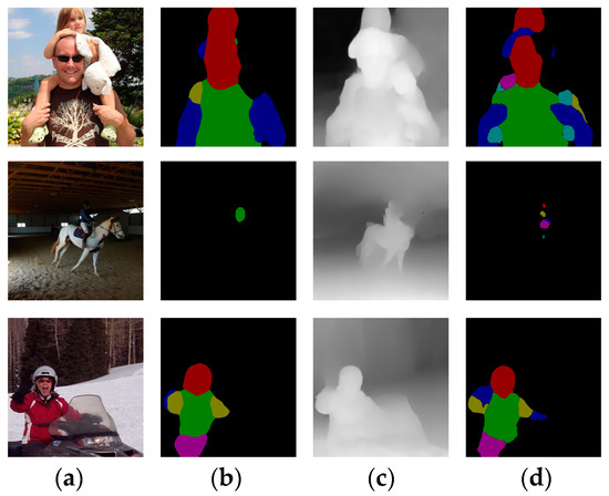 The advantage of integrating a Depth-Model with Segmentation-Module comes in two ways. Firstly, the training data for depth estimation can cover the variations which seldomly appear in the training data for human parsing. Robustness is improved in this way. Secondly, depth estimation and segmentation are closely correlated. The former assigns continuous depth values to pixels while the latter assigns discrete categorical labels to pixels. The predicted depth maps facilitate hierarchical descriptions of images which are helpful for segmentation. The learning process is divided into two stages: (1) To train the DM on the large-scale MegaDepth Dataset [24] collected from Internet photos. (2) Both the training and testing of SM were based on the predictions from the DM and original RGB images [2,7]. The strategy introduced in Section 3.3 was applied. As is shown in Figure 1, DM helped to focus the SM’s limited capacity on the qualified regions and boost the performance of segmentation. Each input image of the SM had four channels, RGB and the depth prediction from DM.