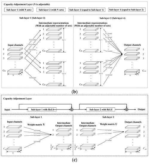 Besides improving depth which leads to the increase in computational complexity, we also propose to exchange width for depth to obtain further improvements in accuracy while reducing the number of parameters. Two methods have been proposed to reduce the complexity of convolutional layers by replacing one conventional convolutional layer with a stack of simplified layers. The overall complexity of stacked simplified layers is less than that of one original convolutional layer. The mechanism is shown in Figure 5. Figure 5b shows our first proposed way of exchanging width for depth. In one conventional layer, independent 3 × 3 convolutional kernels function on channels to obtain one output channel. In one simplified sub-layer, () kernels function on each of the input channels and the intermediate representation has output channels which are processed by 1 × 1 convolutions. is the number of sub-layers which are stacked to replace one conventional layer. Even if one sub-layer is less expressive than one conventional layer with the same and , the stack of sub-layers achieves a higher expressive power than one conventional layer without increasing the overall number of parameters for proper choices of and . In Figure 5c, the second way of exchanging width for depth is introduced. Each conventional layer is replaced by two sub-layers. The difference lies in that Figure 5b uses 4 sub-layers to replace one conventional layer, while Figure 5c uses two sub-layers.