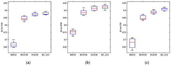 where and are two segmentation results. shows the number of pixels in the corresponding area. The more accurate the segmentation results, the higher the JS. The JS coefficient for GM, WM, and CSF acquired from MICO, BCFCM, FLICM, and RC_LCI are shown in the boxplots of Figure 4. As shown in Figure 4, RC_LCI had the highest JS compared with the other three models and had no outliers in its JS, which revealed that RC_LCI not only had better robustness to noise but also higher accuracy than the other three models. Both visual and quantitative evaluations showed that the RC_LCI model was more robust to different noises and could obtain more accurate results than the other models, whether considering synthetic or real images.