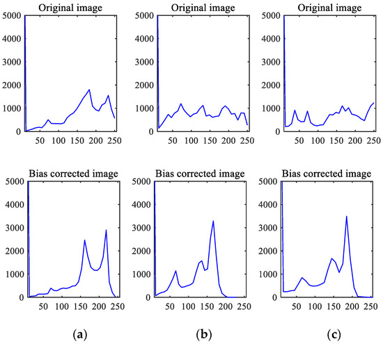 The histograms of the original and bias field correction images: (a) the histogram of axial-sectioned images; (b) the histogram of sagittal-sectioned images; and (c) the histogram of coronal-sectioned images.