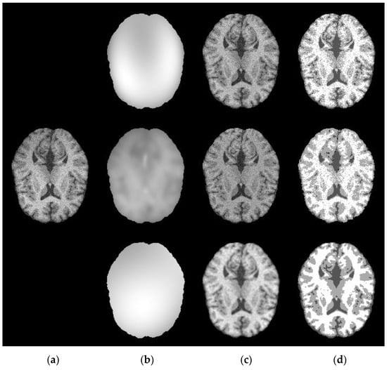 Segmentation results of inhomogeneous intensity brain MRI: (a) original images; (b) estimated bias field; (c) bias field correction images; and (d) segmentation results.