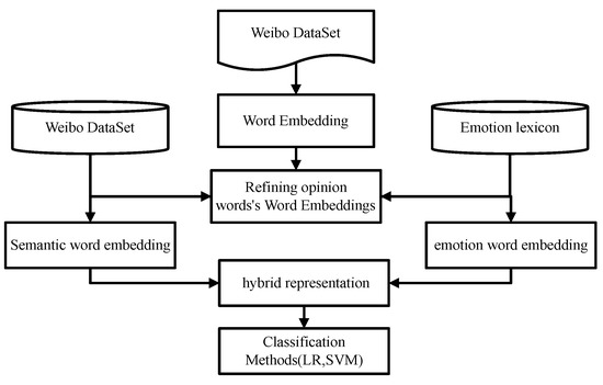 The method comprises three main components: (1) the construction of semantic word vectors based on Word2Vec; (2) the construction of emotional word vectors based on the emotional lexicon; and (3) the construction of hybrid sentiment-aware word representations. The third step is based on the results of the previous two steps.