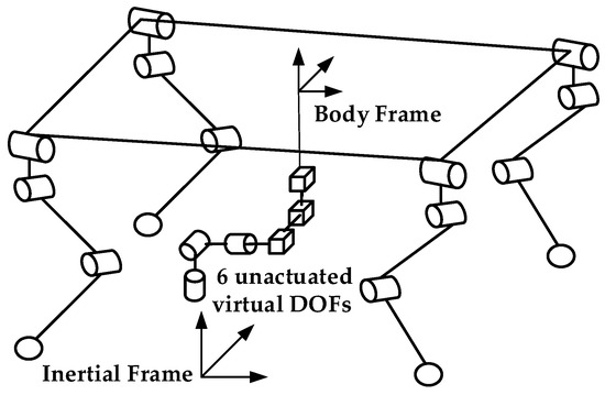 The base frame attached to the robot is connected to the inertial frame via 6 unactuated virtual DOFs.