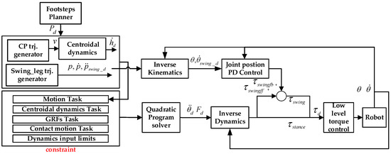 A feedforward and feedback control system is designed to generate a robust walking gait in Figure 3. From a set of time series of quadruped robot footstep positions, a target Capture Point reference is calculated. The desired velocity of the CoM can be obtained by Equation (17) based on the current robot state x (Section 2.3.1). The desired momentum rate of change is provided by Equations (23) and (25) (Section 2.3.2). Meanwhile, the swing foot trajectory based on quintics order polynomials will be generated. Given a desired rate of change of the centroidal momentum, and taking the swing foot motion, floating base system dynamics equation, limitations on the GRF, joint torque limits and contact motion as constraints, we set up a QP (Section 2.3.3). The QP solver outputs the joint accelerations and GRFS, which are then used to calculate the desired joint torques using an inverse dynamics algorithm via Equation (34). While in simulations it is possible to directly apply the joint torques computed by the whole-body control system, the physical quadruped robot can only be controlled through motor current commands. Because of the errors between the multibody model and the real robot, during the swing motion we increase the PD gains of the swing leg joints to improve the tracking capabilities. Overall, we compute the desired torques though: