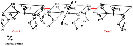 In the simplified model, when a quadruped robot is supporting its body on two legs, the behaviour of a pair of legs acting in unison can be represented by an equivalent virtual leg [32]. In this paper, we extend the concept of virtual leg. No matter how many legs in contact with the ground, it can be equivalent to a virtual leg, as depicted in Figure 4. GRFs at the contact point can be mapped to the CoM though the matrix B.