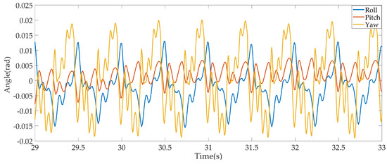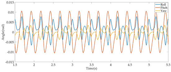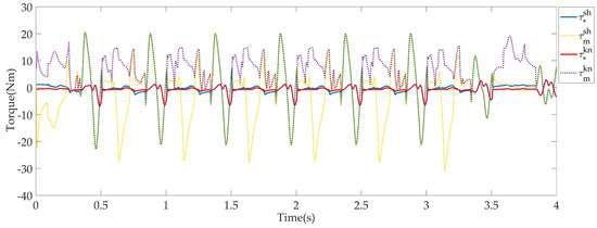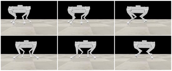 Snapshots of the robot trotting in the simulation are shown in Figure 9. The joint torques of the left front leg of the quadruped robot during a forward velocity of 0.4 m/s are shown in Figure 10. According to Equation (9), , where . When the left front leg is in the swing phase, .When the left front leg is in the stance phase, It is observed that provides a minority of the total torque whereas (torque against the GRFs at the foot) play a prominent role, indicating that the torque is insensitive to the dynamics model errors. This is why we chose to use a PD feed-back joint position control only for legs in swing mode.