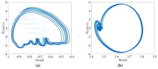 (a) Phase portrait of the hip joint in the simulation; (b) Phase portrait of knee joint in the simulation.