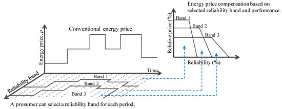 Under the proposed dynamic energy-reliability pricing-based transaction mechanism (ERT), however, the utility announces reliability bands on time as well as price on time to prosumers, as shown in Figure 1. A prosumer responds to the utility with their expected demand and selected reliability band. The utility can announce the reliability price for each band for each time. Therefore, the communication is two-way. The proposed ERT is two-dimensional, since both the energy price and reliability price are included, as follows: