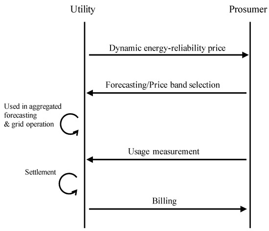 - Settlement and billing) The utility aggregates the individual prosumer forecasts and commitments, incorporating this information into its own forecasts and grid operation plans. The basic assumption here is that, by obtaining prosumers’ forecast and band selection information, a utility can increase its own forecasting accuracy regarding both amount and uncertainty. Even if the utility’s forecast based on this information includes errors, it can minimize its financial risk by penalizing prosumers for inaccurate forecasting. Based on a prosumers’ band price selection, the utility or prosumer can perform settlement based on the prosumer’s energy usage. Then, billing occurs as usual,
