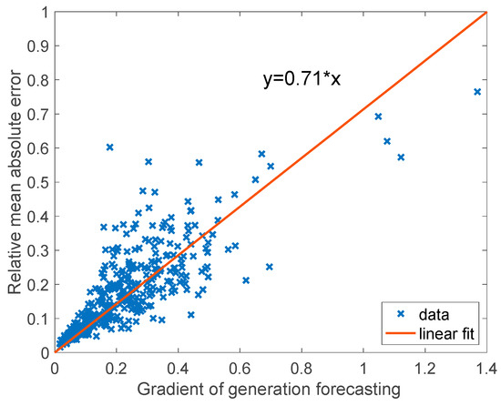 The relationship between the gradient of generation forecasting and the relative mean absolute error of Bonneville Power Administration (BPA)’s wind generation.
