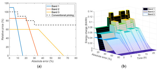 To compare the performance, an energy price with a step-down penalty charge [28] was considered as the conventional case, expressed as conventional pricing shown as a dashed line in Figure 6a. For a fair comparison, the band of the proposed price, , is designed to have the same revenue as the conventional pricing case when they do not make any effort,