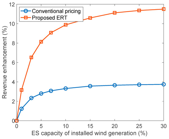 Figure 8 shows the revenue enhancement by the conventional pricing and the proposed ERT when the size of EES is increased to 30% of the installed generation capacity. The EES is operated to maximize prosumer revenue by reducing the error between the generated forecasting and the actual generation, so the revenue is enhanced in the dynamic prices. The revenue converges on a 4% enhancement over the conventional pricing, but the value in the proposed ERT grows continuously, up to a value three times higher than that under the conventional pricing. This shows that the proposed ERT is designed to work well in relation to prosumer dynamics, giving the prosumer greater motivation.