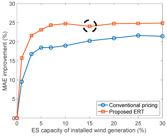 For utility, grid reliability can be defined as such factors as voltage stability and frequency regulation state maintenance [29]. It is required for better situational awareness and operator assistance to improve grid reliability [5]. The predictability is an important term that affects reliability. In this work, the mean absolute error (MAE) between the actual generation and its forecasting is used as a performance metric to measure predictability. In Figure 8, the MAE improves with increasing EES capacity. It is said that grid reliability improves with increasing EES capacity. Additionally, the MAE under the proposed ERT has a lower value than that under the conventional pricing mechanism. This means that the implementation of the proposed ERT effectively improves grid reliability versus the conventional pricing case. However, the MAE is not monotonically improved, as shown by the proposed ERT case with 15% EES capacity of installed generation (the point in the dashed circle in Figure 9). This is because the performance of MAE not only relates to the price but also the generation characteristics.
