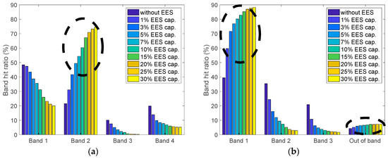 The change in band hit ratio under the conventional pricing mechanism and the proposed ERT with varying EES capacity. (a) Conventional price case; (b) Proposed ERT.