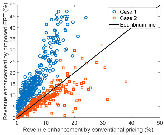 Figure 12 shows a comparison of the revenue enhancement by the conventional pricing (Case 0) and two ERTs (Case 1 and 2) when 10% EES capacity of installed generation is used. Case 1 is the ERT discussed in previous sections, and Case 2 has the design values expressed in Table 2. Each of the 360 points in Figure 12 expresses the daily prosumer revenue enhancements.