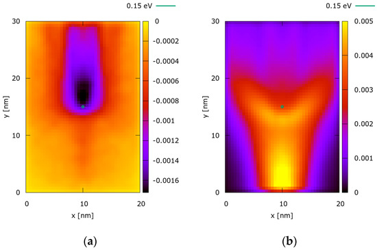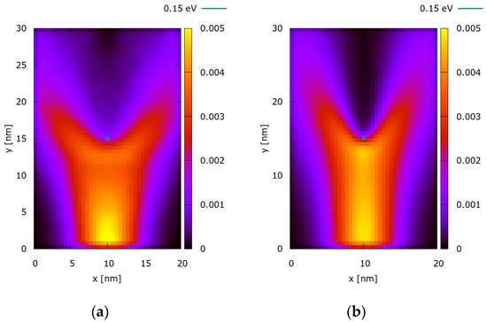 We consider as a reference frame the classical (Boltzmann) distribution, characterized by: and where is the classical density. Figure 2a,b show respectively and . The quantum density, represented by the sum , is shown in Figure 3a. These quantities reflect the following evolution process. In the region below the dopant, denoted by the green 0.15 eV isoline, the electron flux splits into two entangled parts. These maintain the coherence in the region after the dopant, as no dissipation processes are involved. This results in the interference fringes well visible in the upper parts after the dopant of both figures. Remarkably, exhibits firmly negative values in a wide region around the dopant. However, their pattern does not reflect the symmetry of the potential and thus they can’t be associated to the nonlocality of the quantum action. The most pronounced negative values are placed after the dopant, in the region of evolution of the two entangled parts. Now, one can connect this negative region with the fact that, quantum mechanically, the scattering process requires a “collision duration” [31]. Quantum mechanically, the wave must first build up a correlation with the impurity, and this is then broken up when the collision is completed. The fact that the entanglement exists beyond the impurity is recognition that the event takes a non-zero amount of time to complete. This is true for the impurities as well as for phonons [32]. A similar push of the effect of the impurity potential to the anterior region can be caused by nonlinear screening due to dopants in the contacts [33], although no such screening is used here. In contrast, such behavior is entirely missing in Figure 3b, where the classical density is reported: The corresponding region is entirely empty! This shows that the negative excursions of the Wigner function provide a direct indicator for interference effects.