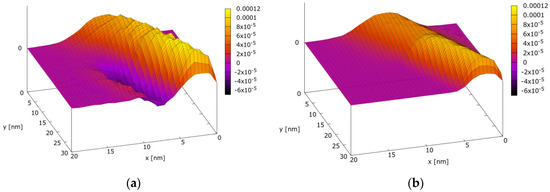It is interesting to see if such analysis can be carried out on other types of projections or is specific to the presented one, where we intentionally separated the negative values of the Wigner function. As a second experiment we consider the Wigner function for two specific points in the momentum space that are (kx1 ky1) = (−0.26 nm−1, 0.89 nm−1) and (kx2 ky2) = (0.26 nm−1, 0.89 nm−1). The choice of these two points is related to the fact that they are near to the mean momentum along the y-direction (0.84 nm−1) and symmetrically placed around the initial momentum in the x-direction. Classical particles with such momentum coordinates exit near the upper corners of the simulation domain, thus entering well in the region of interest above the dopant, where we expect entanglement and interference effects in the quantum evolution. This can be seen in Figure 4b, Figure 5b and Figure 6b presenting the classical distributions , , and their sum, respectively. The choice of two specific symmetric points with respect to the initial momentum does not limit the analysis, since the evolution of the system is symmetric with respect to the initial momentum, and the choice of all the couples of symmetric points will give a full recovery of the Wigner function. For convenience the viewpoint in Figure 4, Figure 5 and Figure 6 is now rotated, so that the exit (formerly upper) part of the simulation domain is now the closest one. The corresponding quantum function shown in Figure 4a reveals a well-pronounced negative part, which begins around the dopant and is extended until the boundary. The same holds for the function , Figure 5a. We note that in both cases the negative parts are ”internally” placed in the region of correlations between the left and right parts. In Figure 6a we report the distribution obtained by the sum . The quantum distribution presents a negative part in front of the dopant between the two branches and a kind of ”interference” behavior appearing due to the summation of the two components in that region. None of this can be seen in the corresponding classical evolution where the distribution between the two branches is zero.